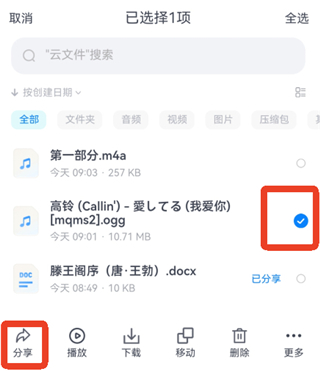 2、点击文件右侧的复选框进行勾选,然后点击界面底部的第一个【分享】按钮。
