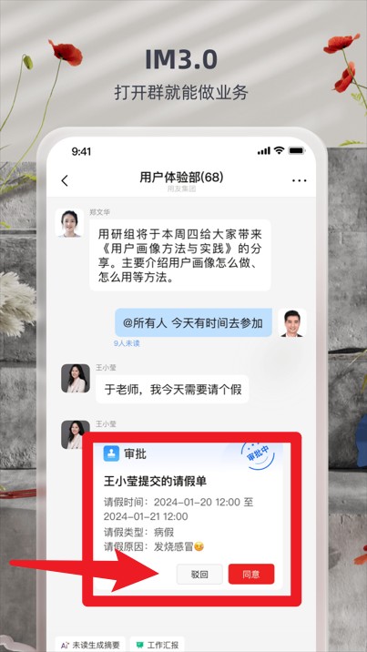 1、在IM3.0群聊中即可发起请假申请审批,快速实现日常事务线上流转与高效处理;