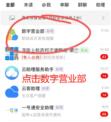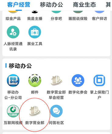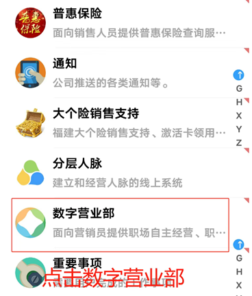 1、新人入职流程:进入频道,点击“数字营业部”选项。