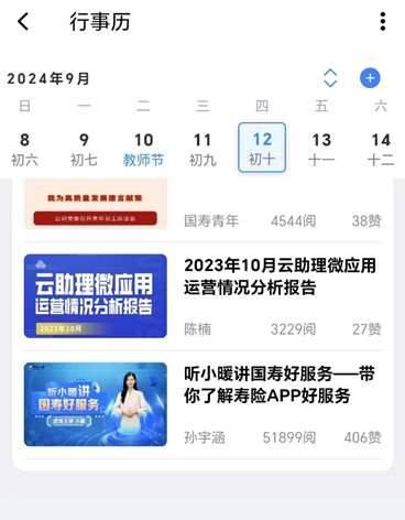 5、云助理可在工作平台中进入“短险产品链接转发”-“更多”-“行事历”-“掌上保险”,点击右上角进行转发。