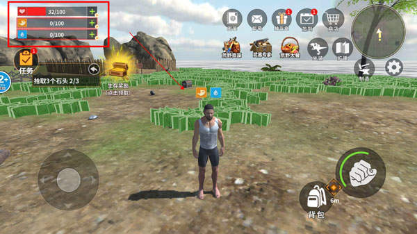 3、界面左上角显示的三色状态条分别代表生命值、饥饿值与水分值。请及时补充消耗,保持数值健康以维持生存。