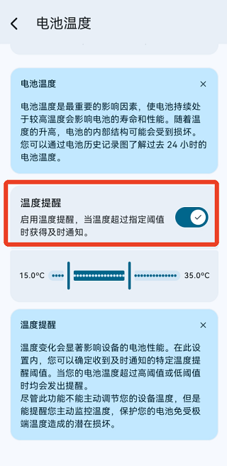 5、在“电池温度”设置中下滑页面,可开启充电保护功能,避免电池温度过高,从而延长电池使用寿命。