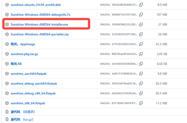 1、安装好Moonlight串流软件后,第一步请访问github获取Sunshine,Windows系统用户直接下载【sunshine-windows-installer.exe】文件。