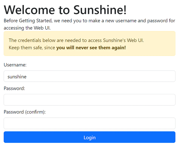 3、在浏览器中打开Sunshine本地访问地址 https://localhost:47990/ ,首次使用需设置Sunshine的登录账号和密码。