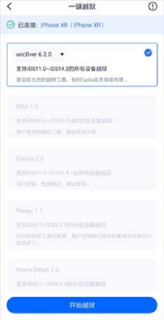 若当前存在支持该iPhone的越狱工具,界面将自动显示。勾选工具后点击“开始越狱”,耐心等待安装完成即可在iPhone上运行越狱工具。