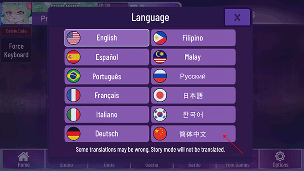 1、打开游戏,点击主界面右下角爱心按钮,可以切换语言。