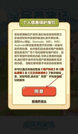 1、首次进入全民养猪场游戏时,需点击【同意】按钮确认个人信息保护指引。