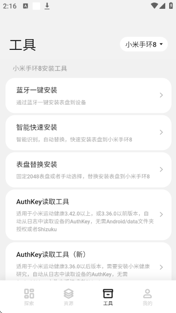 7、在【工具】专区里,提供了多种安装工具。例如“智能快速安装”,可自动识别设备并快速将表盘安装至小米手环8等设备。