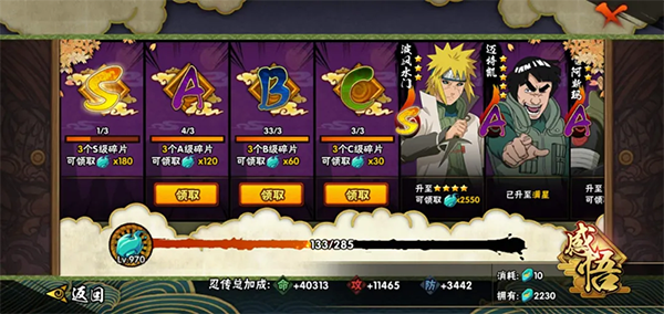 1、忍者收集:在活动期间,累计收集忍者达到4个、8个和10个分别可以获得10金币、20金币和80金币。
