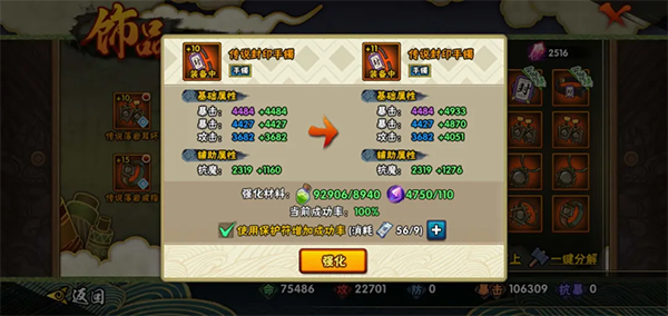 5、而且在游戏中,饰品与忍具的强化成功对于战力提升尤为重要。以饰品为例,在强化时,除了消耗秘术之尘、秘术之星这些固定的道具外,还会消耗保护符,以提升强化成功率。如下图所示: