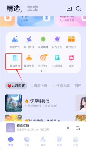 3、选择睡前故事音频助眠,包含儿童寓言与成人放松叙事类型;