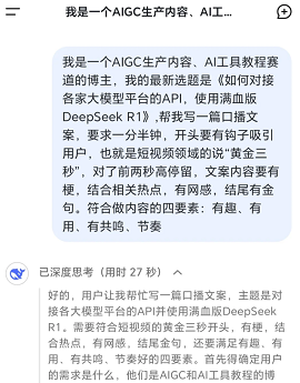 1、在DeepSeek中,详细说明你所在的领域、具体选题及相关要求,平台将依此为你生成一份短视频口播文案。