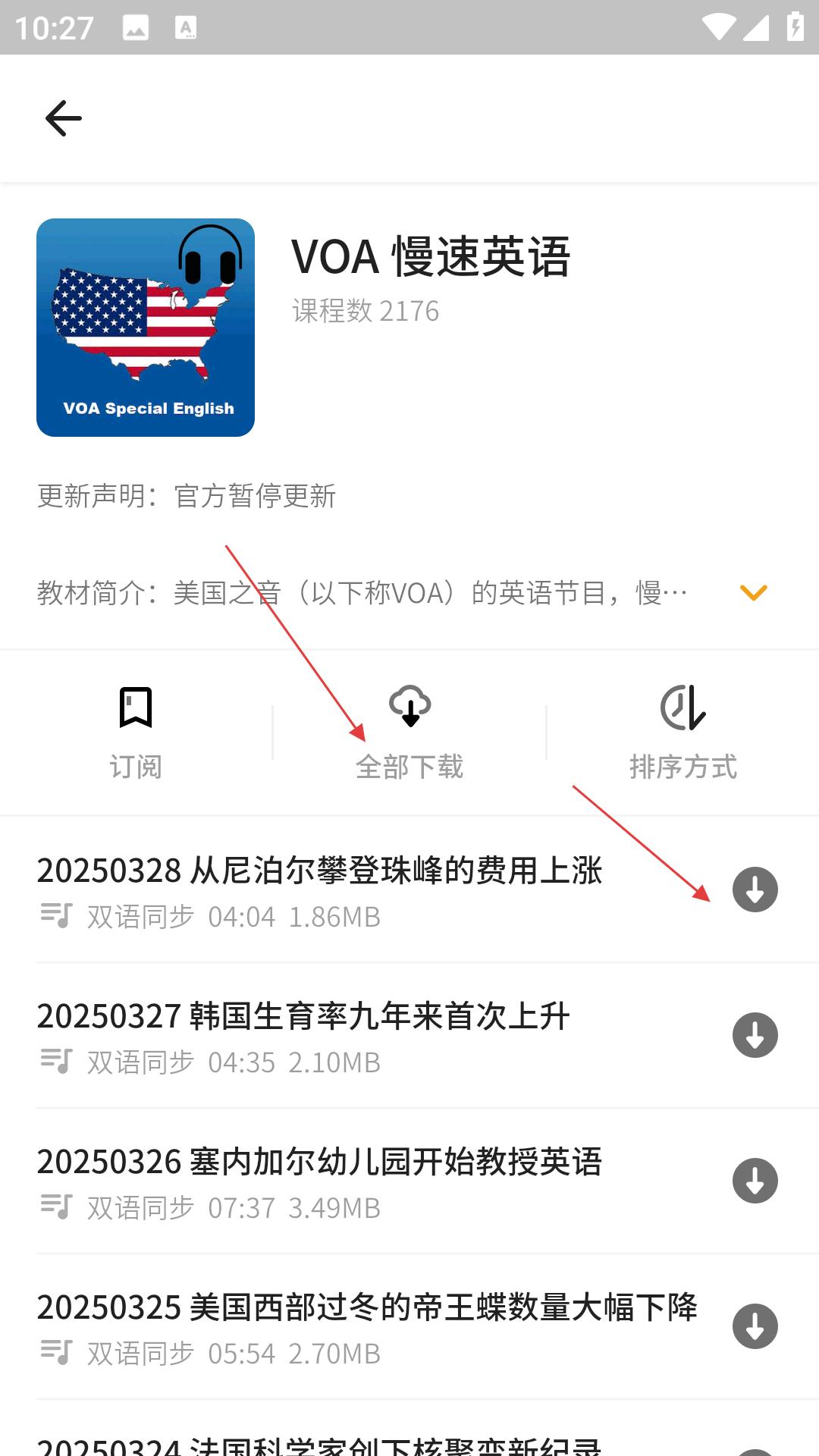 3、进入慢速英语课程界面,用户可选择订阅、全部下载或按排序方式查看课程,也可以选择部分下载音频。