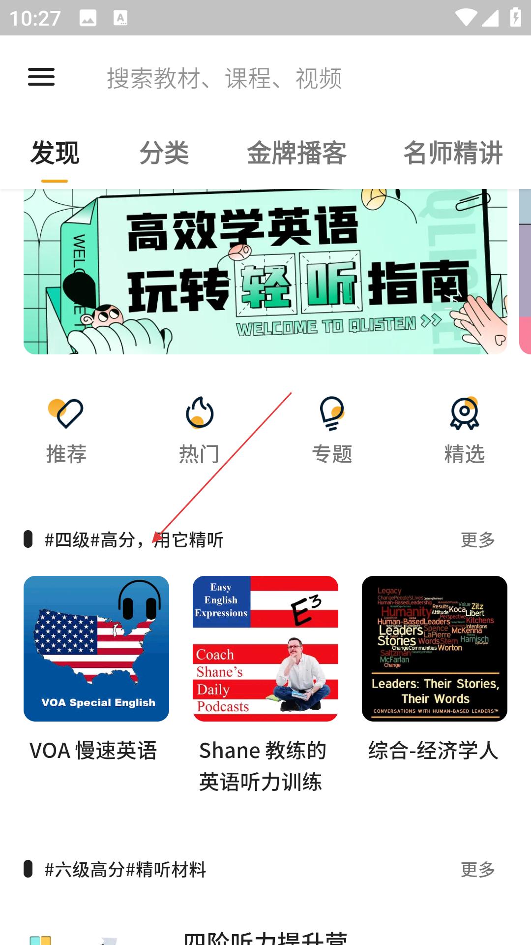 2、发现界面,展示了推荐、热门等分类入口,还有高效学英语等宣传内容,用户可选择不同的英语学习课程进行学习。