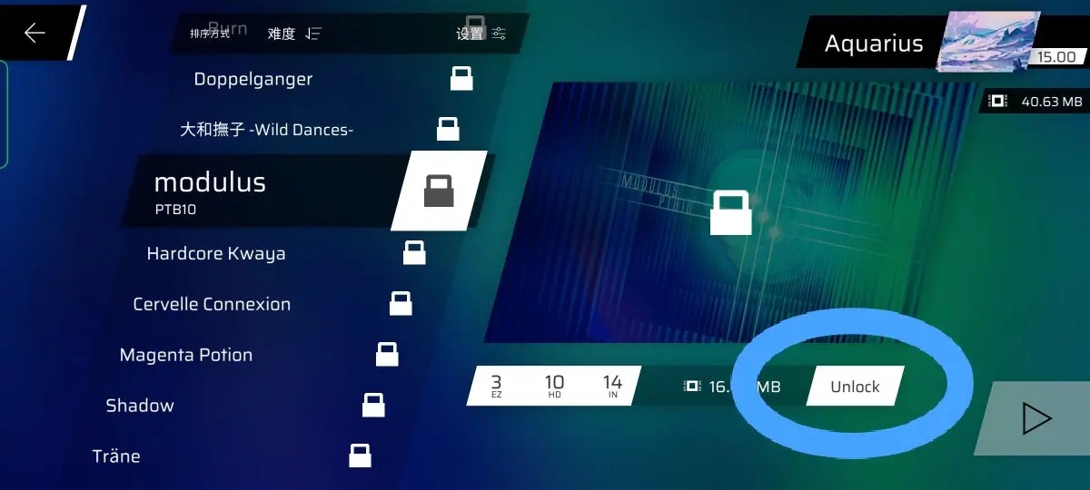 1、如果是Single章节里面的歌曲锁住的话:你需要使用货币购买歌曲,点击Unlock即可购买当前歌曲,每首歌的价格都是16MB,最新版本歌曲的价格是4MB。游玩歌曲,观看收藏品都可以获得Data,所持有的Data数量会在RKS数值的下方显示。
