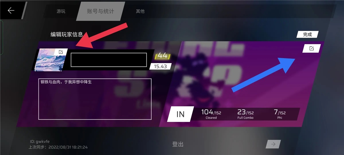 5、目前获得背景和头像的唯一方式就是游玩对应歌曲,有几率获得对应歌曲的头像和背景。红色箭头可以更换头像,蓝色箭头可以更换背景。方框内的名称和签名也可以更改,修改后记得点击右上角的完成。