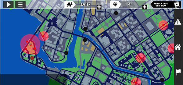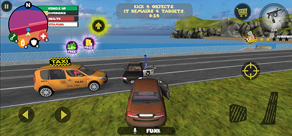 2、每当角色的附近有车辆时,屏幕的左方会有一个汽车头的按钮,点击之后就会让角色就会抢夺车辆,操纵车辆的话在屏幕右下角有两个踏板,左边是删除的按钮,右边是油门,屏幕左下角会有一个类似方向盘的东西,是用来控制方向的,对汽车的操纵一定要好,因为这是我们快速获取金币的最好的办法。