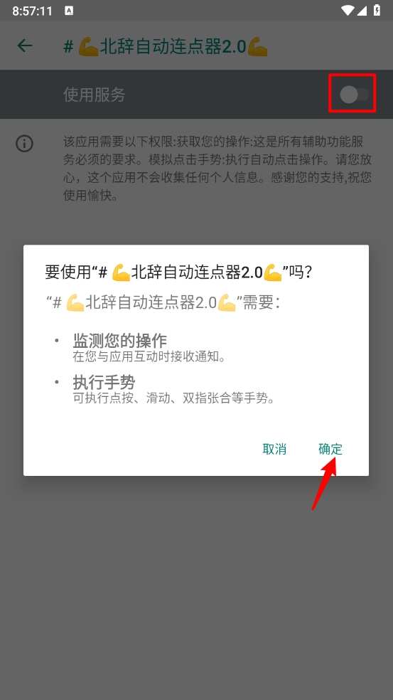4、然后打开使用服务的开关,点击"确定",返回主页。