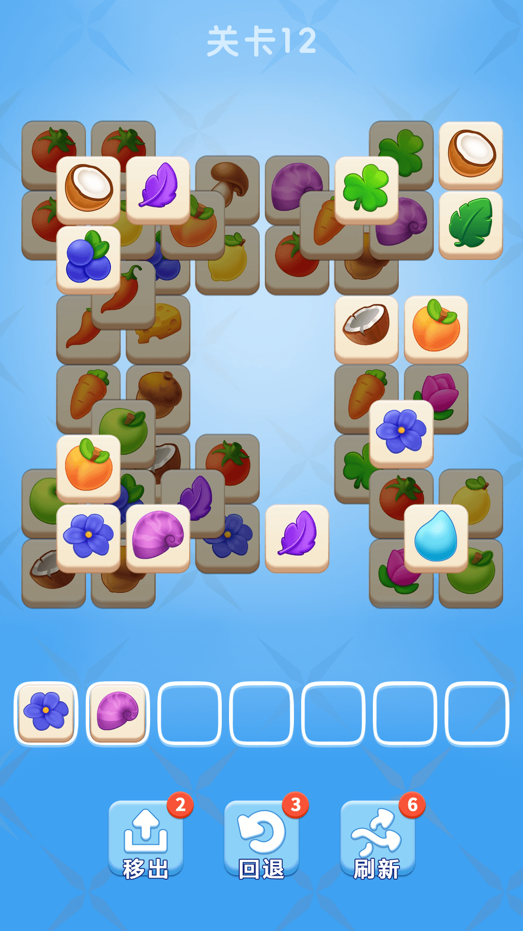 水果乐消消,游戏玩法简单,玩家只需要在众多图片中,找到3个相同的图片,点击就可以消除,与羊了个羊不同的是,方块消消乐主打娱乐休闲,难度并不大,还有免费道具送给玩家,主打一个快乐游戏。