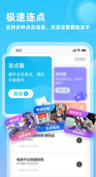 自动连点器app是手机自动点击的辅助工具。让每个人都可以使用夹板随时自动点击手机屏幕。它涵盖了大量实用的夹板脚本,让每个人都可以自由地使用夹板脚本执行重复性的任务点击操作,从而解放双手。它有非常广泛的应用。玩家可以使用它在阅读小说时自动翻页,在抓娃娃或手工赚钱时自动操作,也可以帮助玩家操作游戏。无需插根即可操作,非常简单。