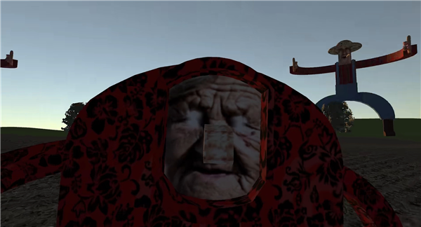 在游戏里的一个房间内,前后各有一人围着玩家,用变调变声的歌声唱着 “挖掘机里腌萝卜,咿呀咿呀哟~”
