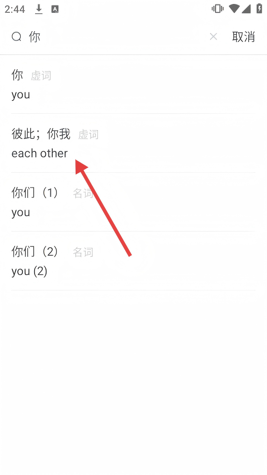 3、输入我们想要查找的内容,选择结果中的【彼此;你我】词条。