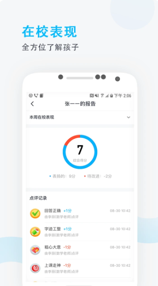 2、成绩单和课堂评价:查看老师发布的成绩单和孩子在校的生活学习状态。
