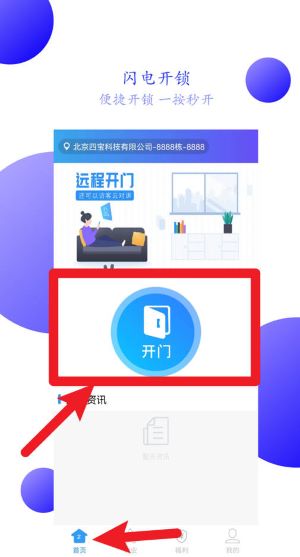 2、在“闪电开锁”页面中,用户可通过手机点击“开门”按钮实现远程解锁,快速响应访客需求。