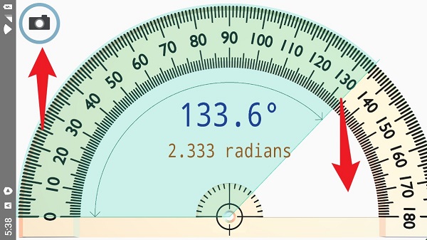 4、使用量角器时,将手机贴近参考角度并对准刻度,角度数值会实时显示在中央区域。