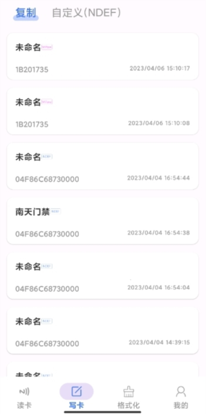NFC Writer是一款实用NFC读、写卡工具,使用它的前提条件是手机必须支持NFC功能。它支持读取、写入、格式化未加密和部分加密MIFARE Classic系列NFC标签或卡片,如一般的门禁卡,电梯卡、停车卡等等,同时支持NDEF格式的读写,比如NFC名片、碰碰贴、音乐墙等。同时APP也自带字典可暴力破解部分加密NFC卡片。写入卡片类型应为CUID类型,网络有售一两块一个,否则会出现写入不了的问题。