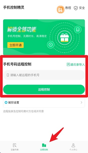 3、在“远程控制”页面输入对方手机号码,点击“远程控制”即可发起控制请求。