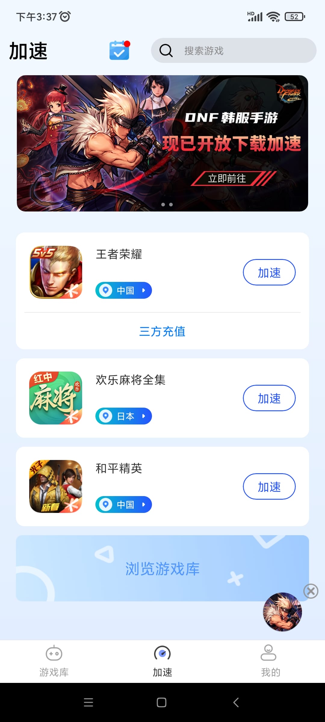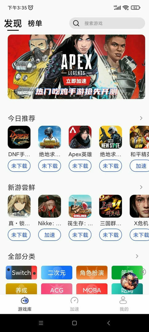 4、在游戏库这里,有绝地求生、DNF手游、和平精英等多种热门手游;