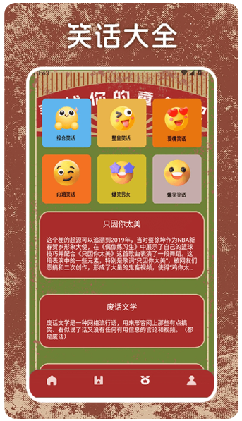 1、笑话分类 软件中的笑话资源分类明确,方便用户选择感兴趣的阅读。