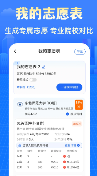 阳光志愿2025高考网为所有高考考生用户提供志愿填报指导服务,帮助用户选择最合适的高校进行填报,提高用户升学率,实现科学计划志愿填报。随时了解自己考试成绩成功的概率,更好地分析和选择报考大学公开所有大学的相关信息,随时了解自己感兴趣的大学,提前了解各大学的具体情况。此外,还可以在线查询大学专业,了解各种专业对应的大学信息。喜欢的话,马上下载使用吧。