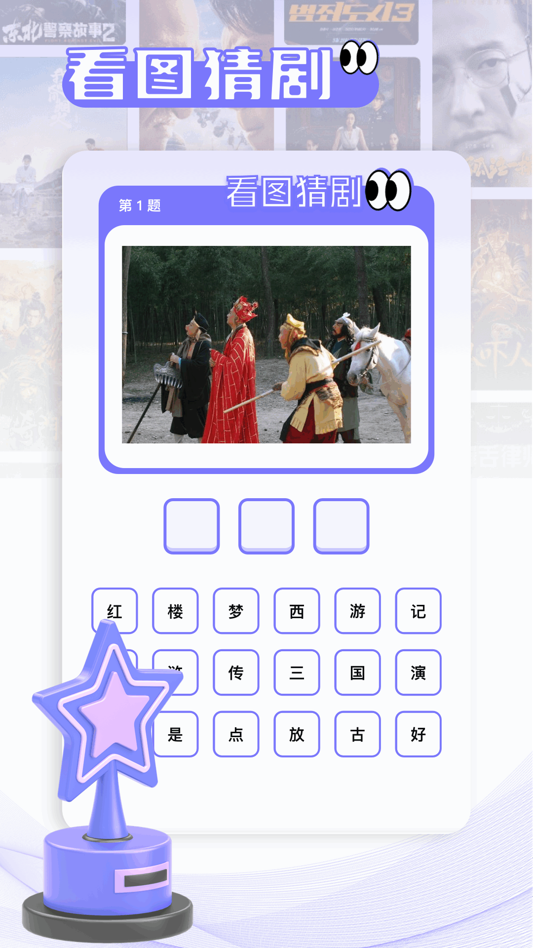 2、进入看图猜剧游戏界面后,认真查看当前关卡展示的剧照内容,然后在下方备选字键盘区域,按照对剧照所关联剧集的认知,点击对应的文字选项,拼写出剧集名称。