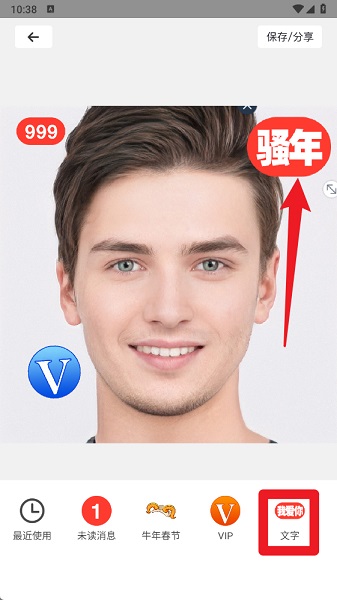 6、点击“文字”功能,用户可在头像上自由添加文字内容,打造个性化的专属标签。