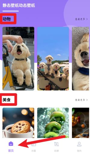 1、在首页可以浏览并选择动物、美食等类别的热门壁纸资源,点击即可进入详细查看并进行设置。