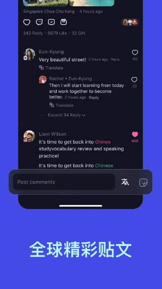 3、全球动态:浏览全球用户的动态,涵盖语言、文化、美食等内容,足不出户体验“全球旅行”。