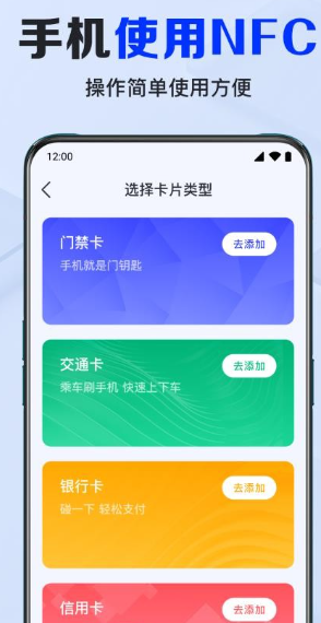 NFC卡包助手app是一款高度智能化的卡片包助手。这里所有的功能都可以免费使用。通过登录并绑定用户的nfc卡,可以在线操作APP。即使是长途旅行,你也不用担心打不开门。是一款安全可靠的APP,确保用户信息的安全。您也可以设置密码。简单的操作为用户带来更好的体验。随时拿出来体验一下。它可以智能穿越交通,快速开启门禁,轻松管理门禁,方便使用NFC卡,享受便捷的生活体验。