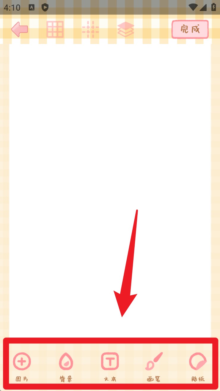 2、在编辑页底部选择工具,可以添加图片、背景、文字、画笔和贴纸等素材。