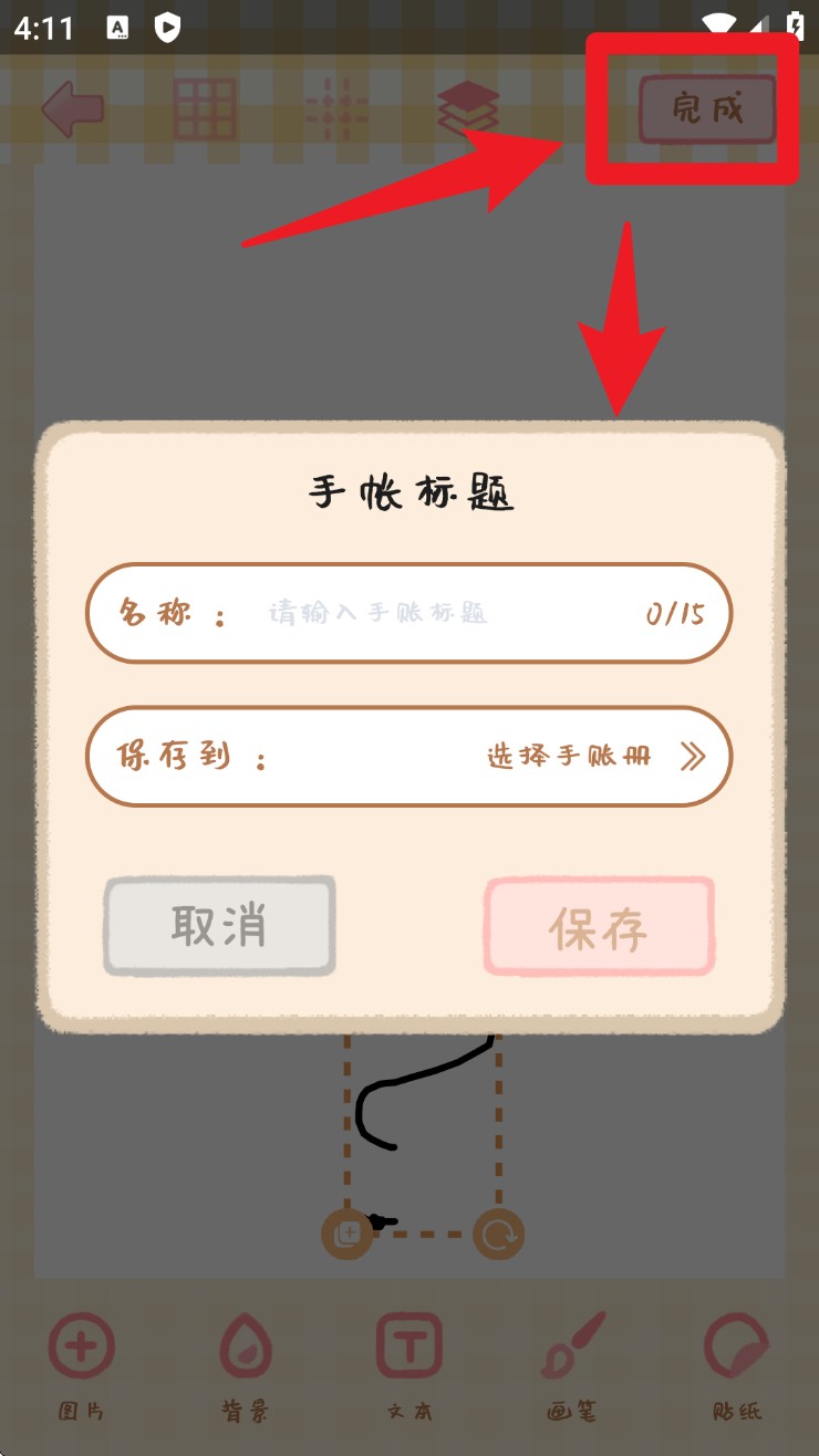 3、编辑完成后点击右上角「完成」按钮,输入手帐标题并选择存放位置即可保存。