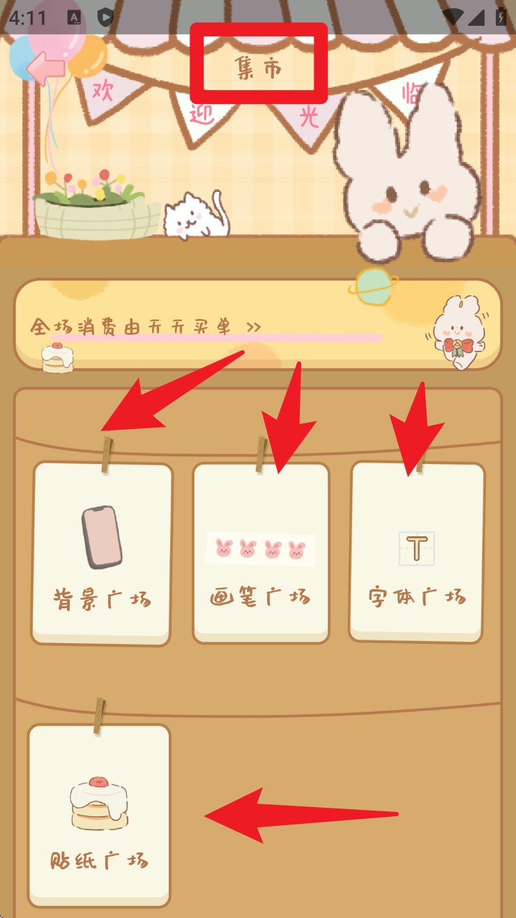 4、返回首页点击「集市」按钮,可以进入背景、画笔、字体和贴纸广场获取更多素材。