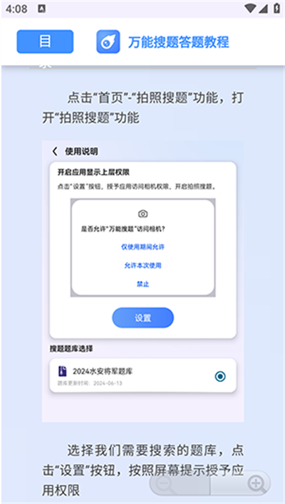 2、选择我们需要搜索的题库,点击“设置”按钮,按照屏幕提示授予应用权限。