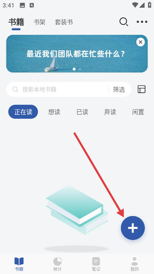 1、打开阅读记录软件进入书籍页面,即底部导航栏第一个,在正在读等分类区域,点击右下角蓝色的加号按钮,触发添加书籍的功能入口,准备导入阅读记录。