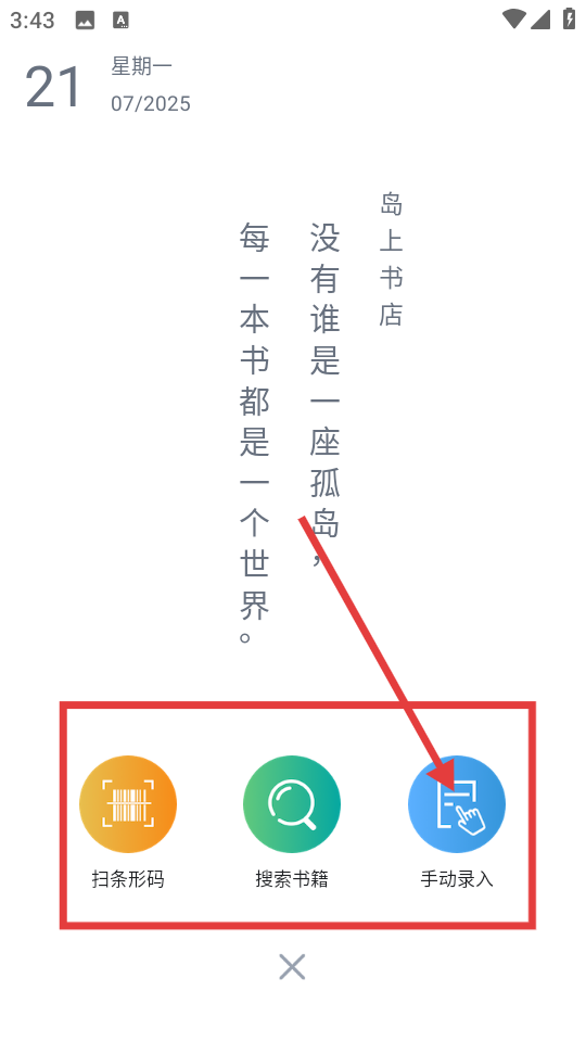 2、点击加号按钮后弹出扫条形码、搜索书籍、手动录入三种方式,假如我们选手动录入,就能进入到书籍信息自主填写的专属界面,开启手动添加书籍记录的流程。