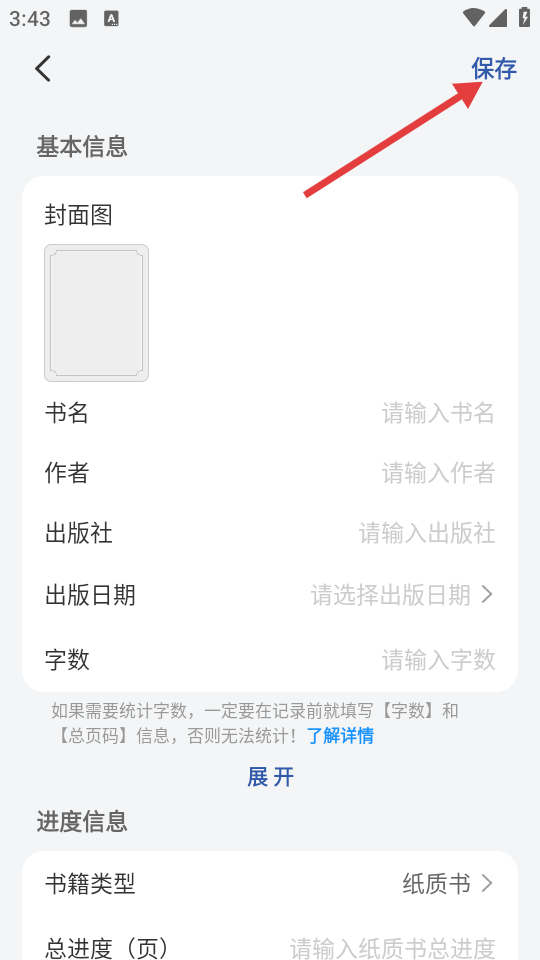3、以手动录入为例进入信息填写页,依次输入书名、作者、出版社等基本信息,填好后点击右上角保存完成阅读记录导入,书籍信息就会添加到软件中。
