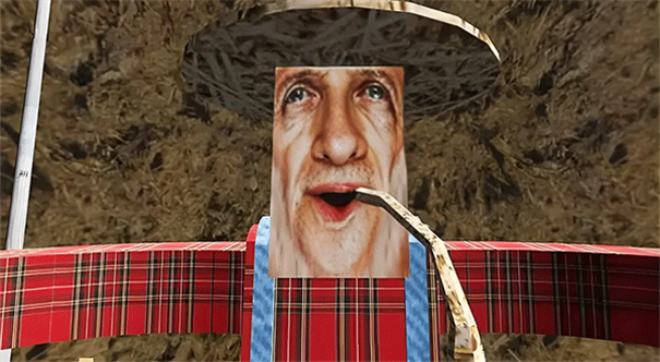 4、完成后将会被老太太绑在凳子上,最后四面八方的“挖掘机里腌萝卜”会把你包围,游戏角色将会被“燃成灰烬”(即游戏失败)。