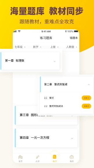 2、教材同步练习 海量题库从一年级至高中三年级,各个版本,各个学科同步教材练习题一应俱全,题目解析清晰易懂,解题过程详细,错题自动整理,查漏补缺,巩固复习好帮手。