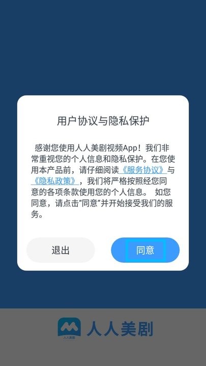 1、在本站下载打开人人美剧视频,阅读弹出的用户协议与隐私保护,点击【同意】;