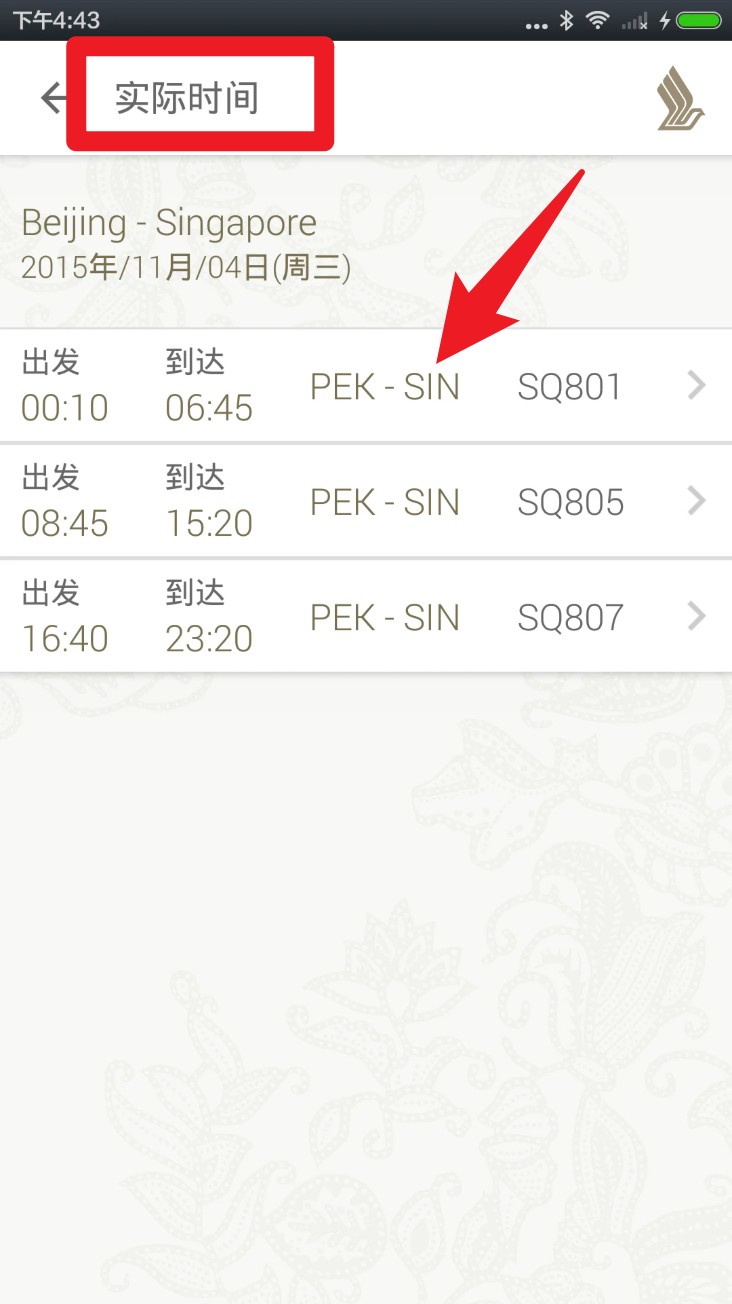3、在“实际时间”页面输入航线与日期,即可查看对应航班的出发与抵达时间详情。